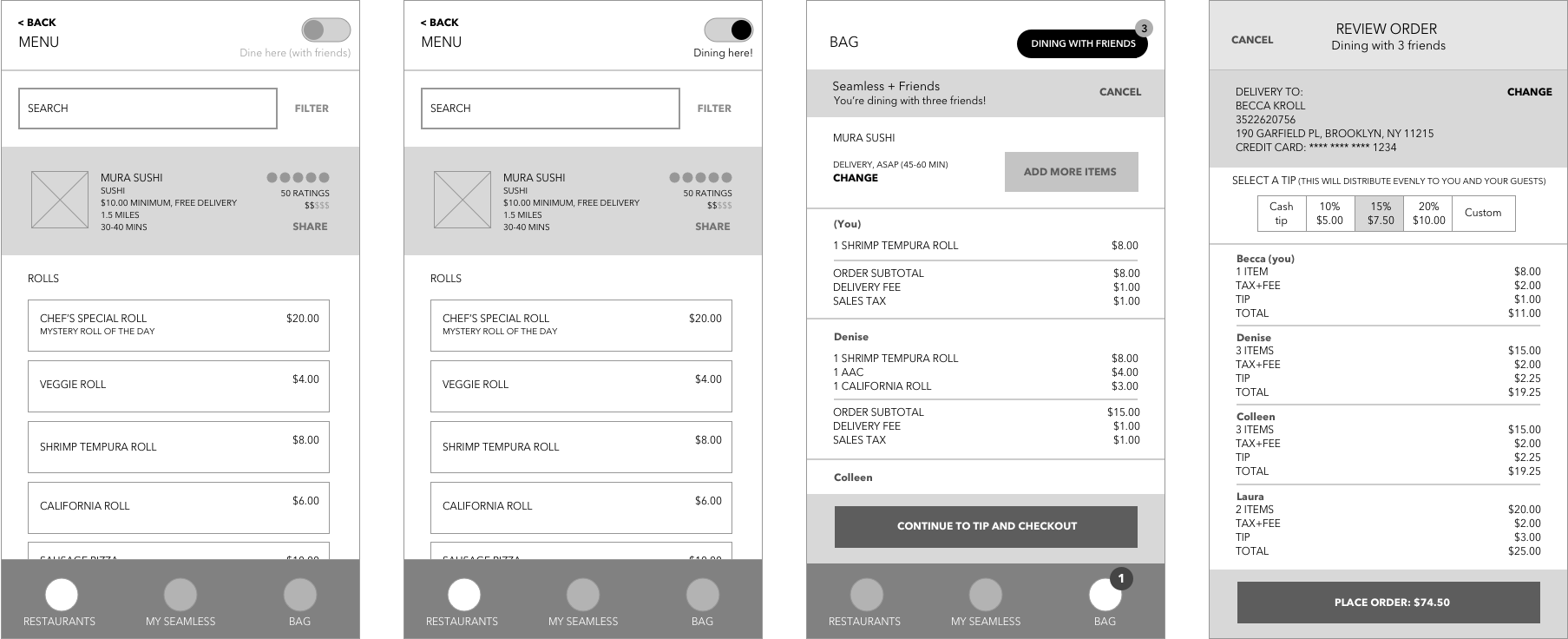 The Dine with Friends feature is available from both the landing screen (“Restaurants”) as well as in the restaurant menu and Bag screen. Everything in red is the current Seamless experience, and the blue is the new Dining with Friends feature.